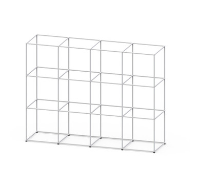 Modular shelving system in various widths and heights with a powder-coated steel base, available in white or black.